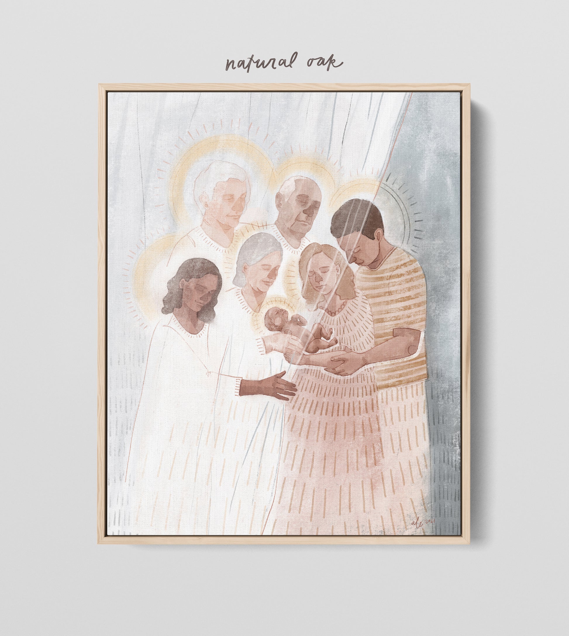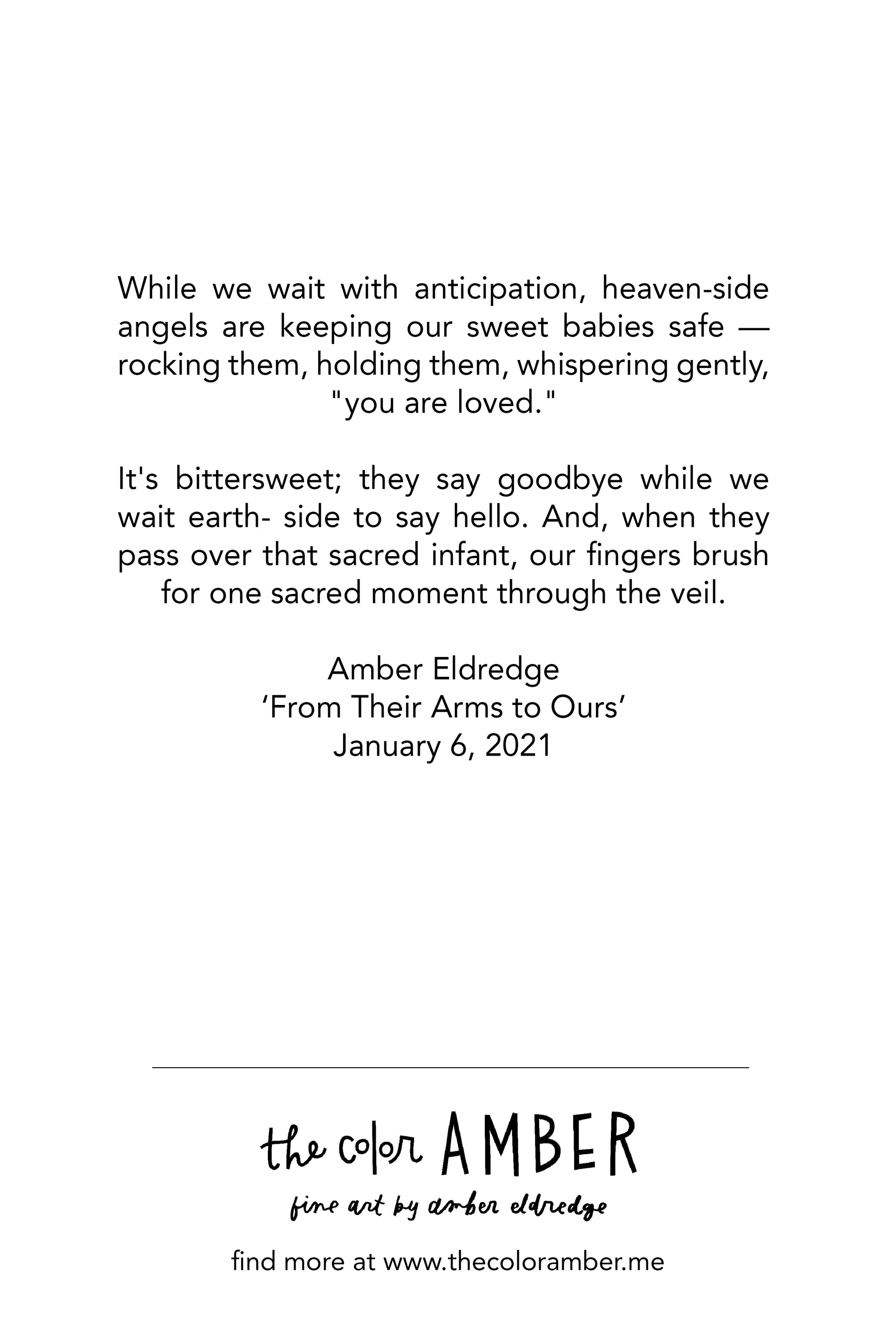 This print and canvas piece, ‘From Their Arms to Ours’, captures the bittersweet connection between earth and heaven as parents say goodbye and hello to their little ones. A meaningful gift for expecting or loss parents, it portrays the tender moment of their fingers brushing through the veil.
