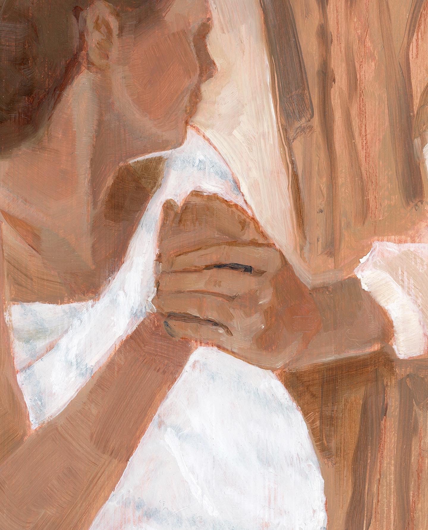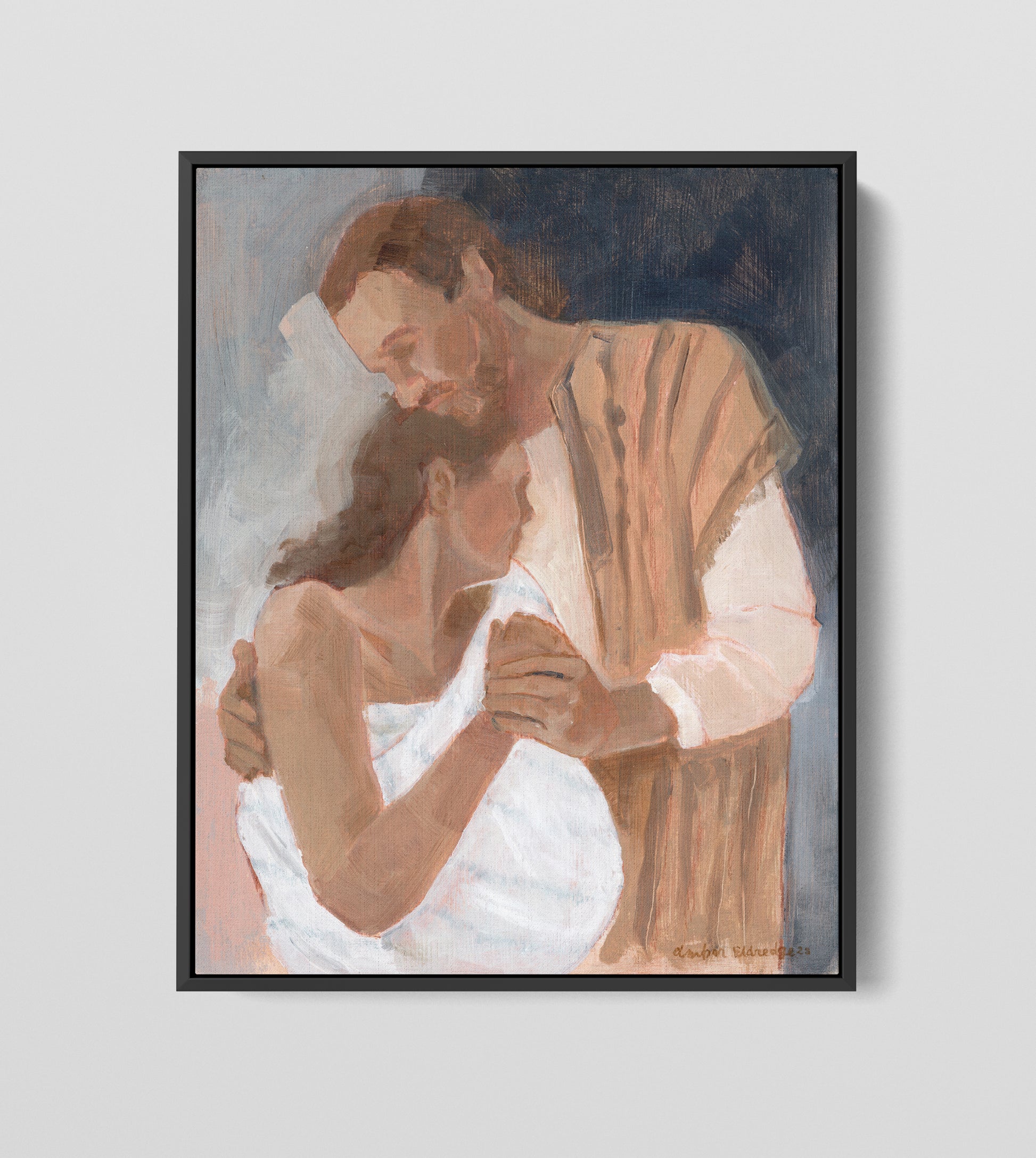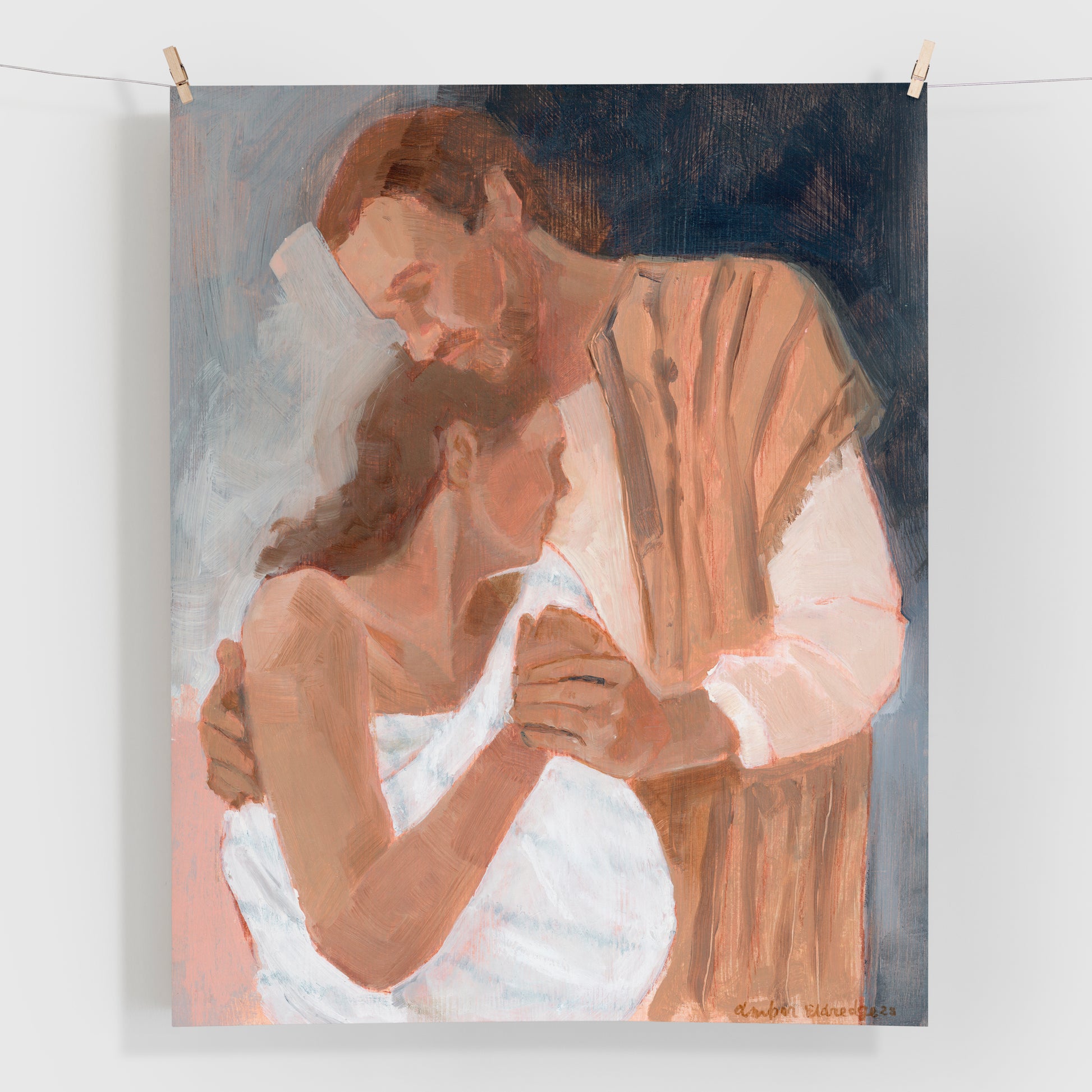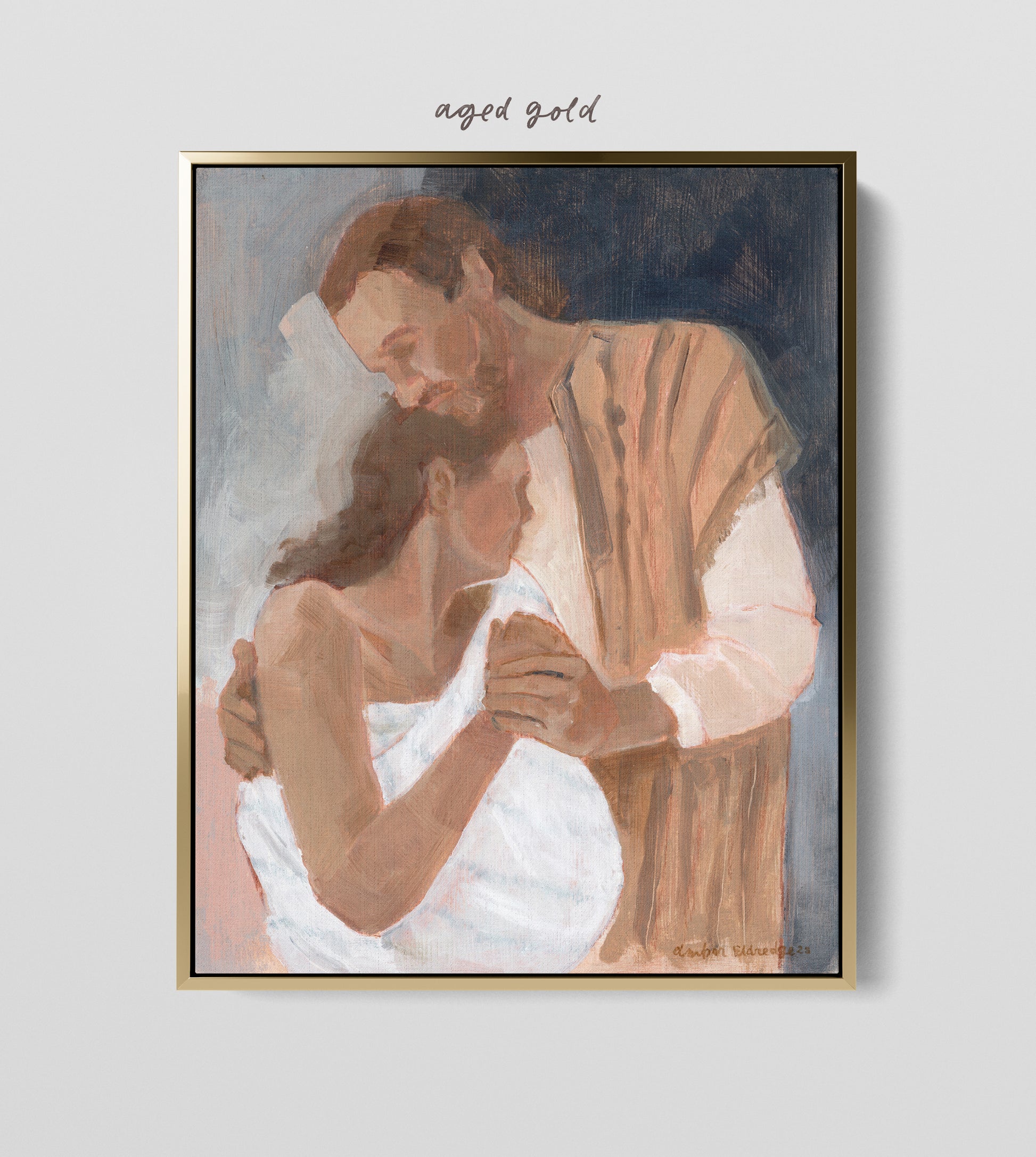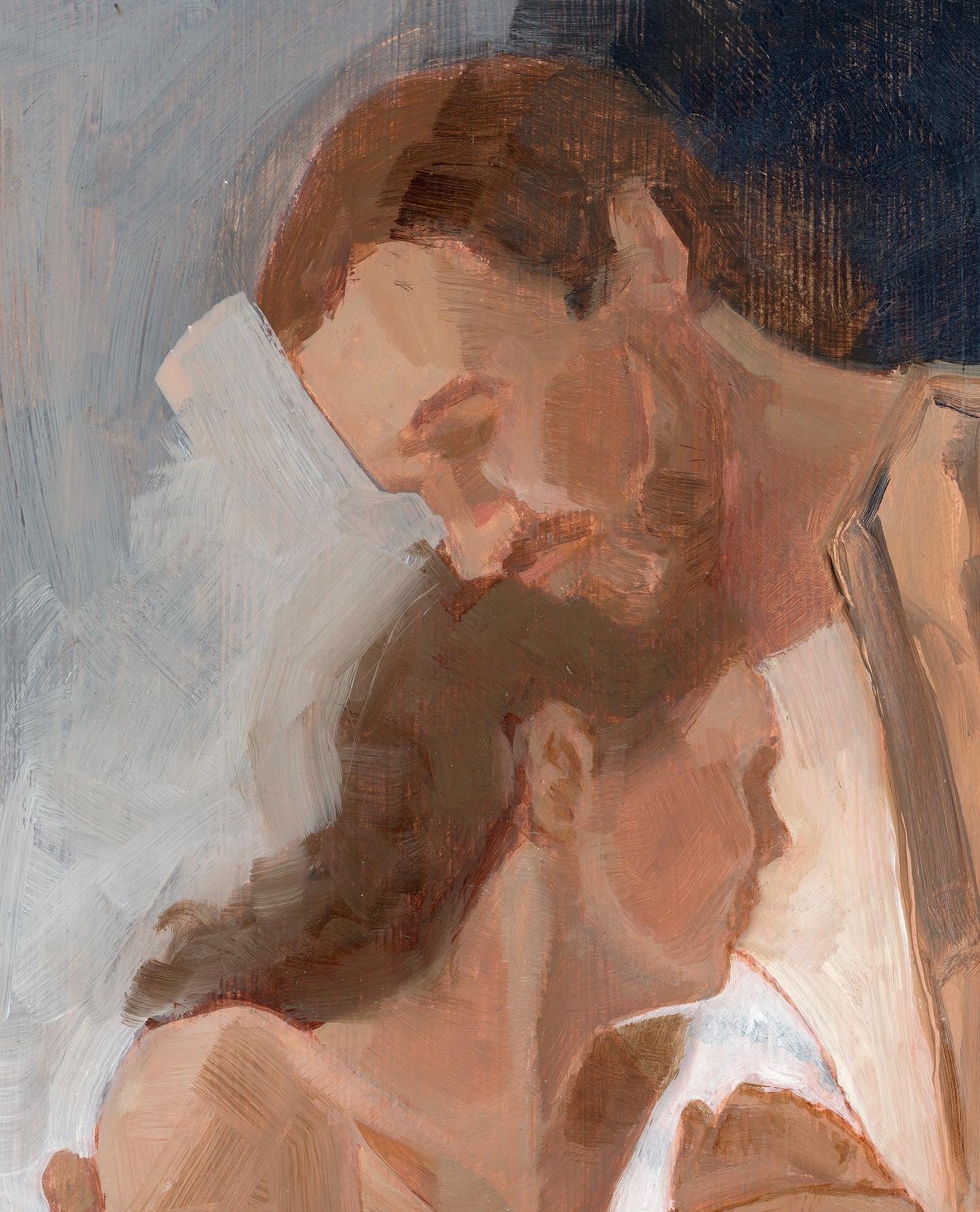 This painting is personal — it represents all the fears & love & pain & wonder of my own laboring experiences. I was lucky enough to have any husband by my side — who said words to me like these ones I imagined Joseph saying to Mary. “I am here with you.”
