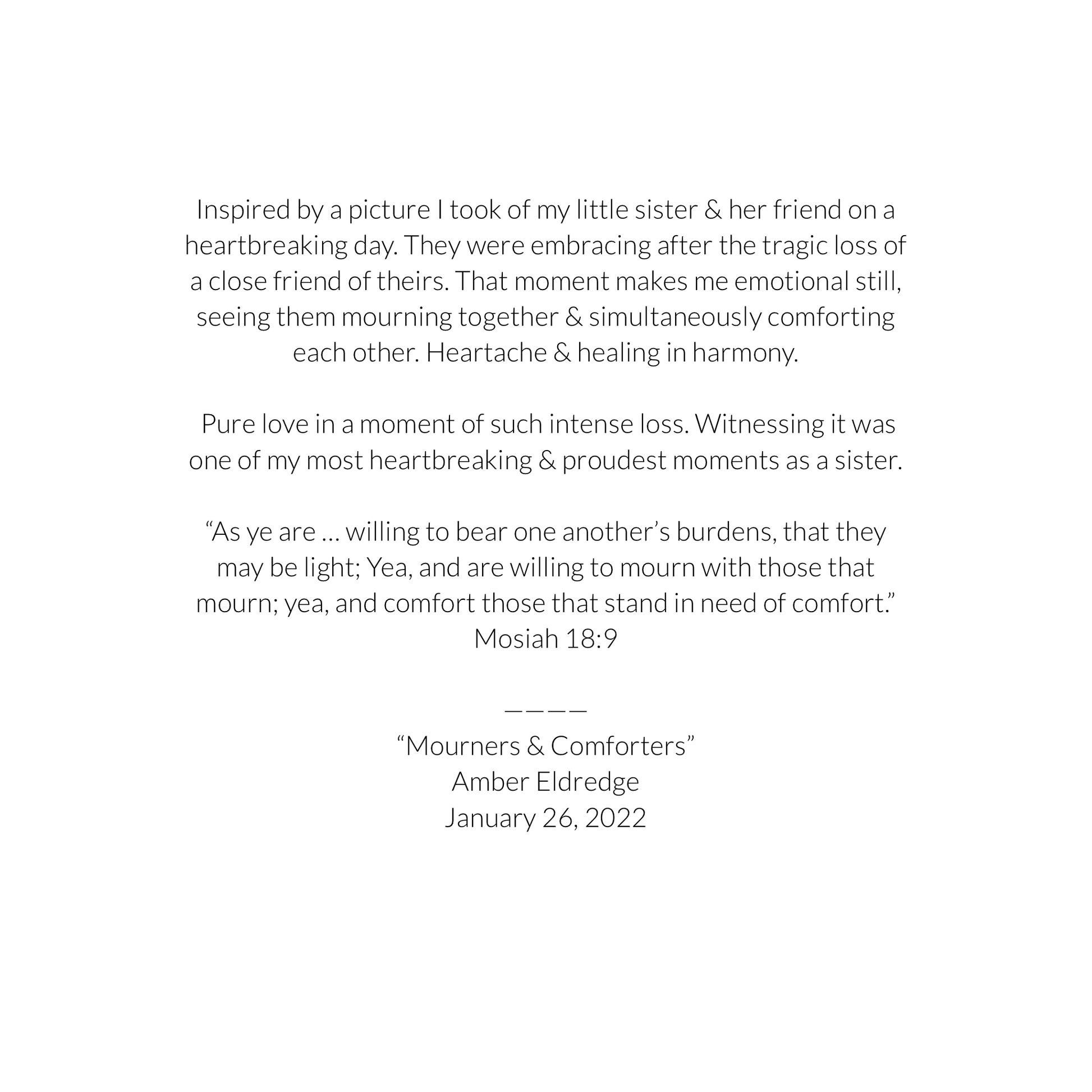 “As ye are … willing to bear one another’s burdens, that they may be light; Yea, and are willing to mourn with those that mourn; yea, and comfort those that stand in need of comfort.” Mosiah 18:9