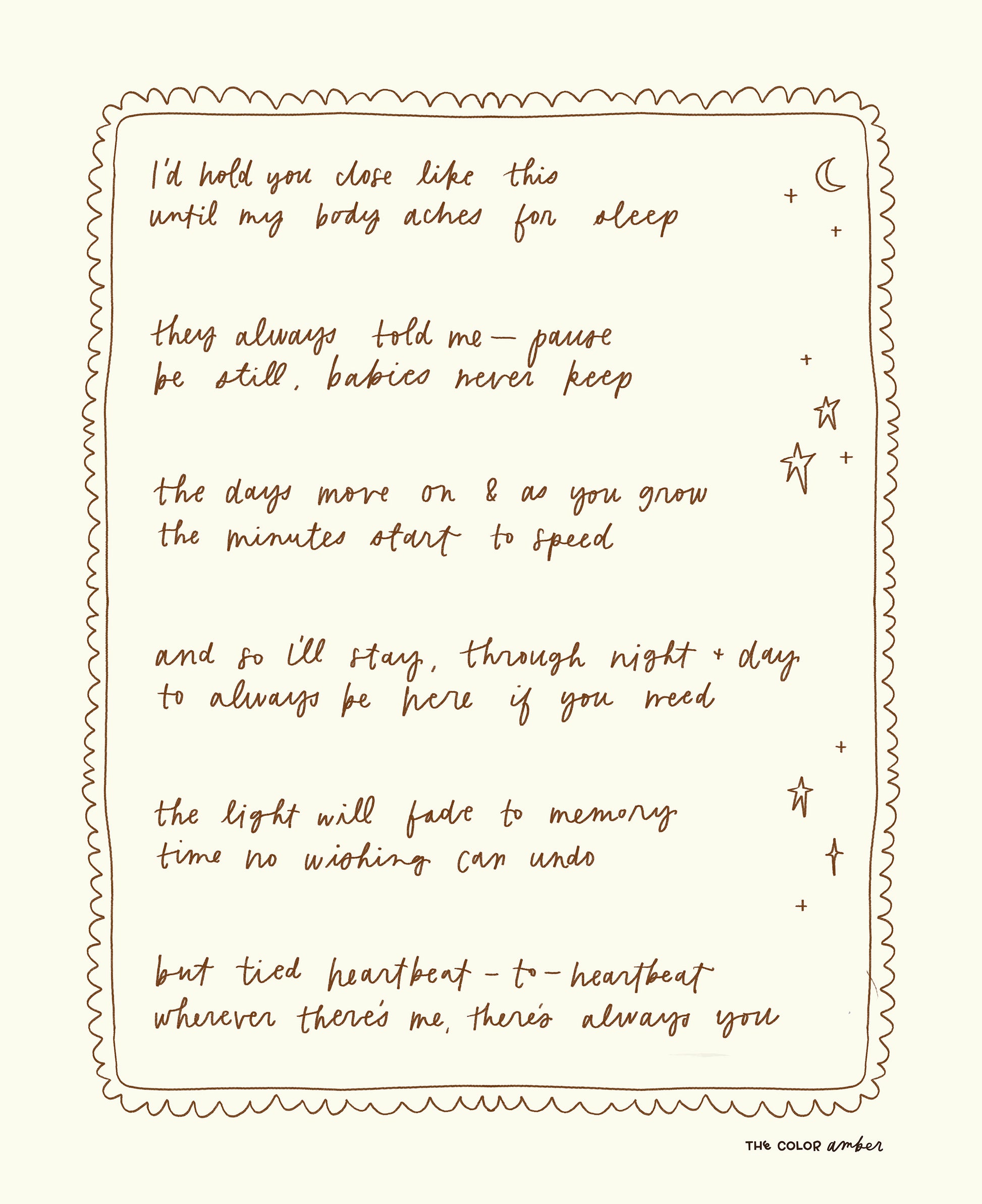 Inspired by my growing baby, who's independence only goes so far. She still needs me in this way, but I know how fleeting this time is.