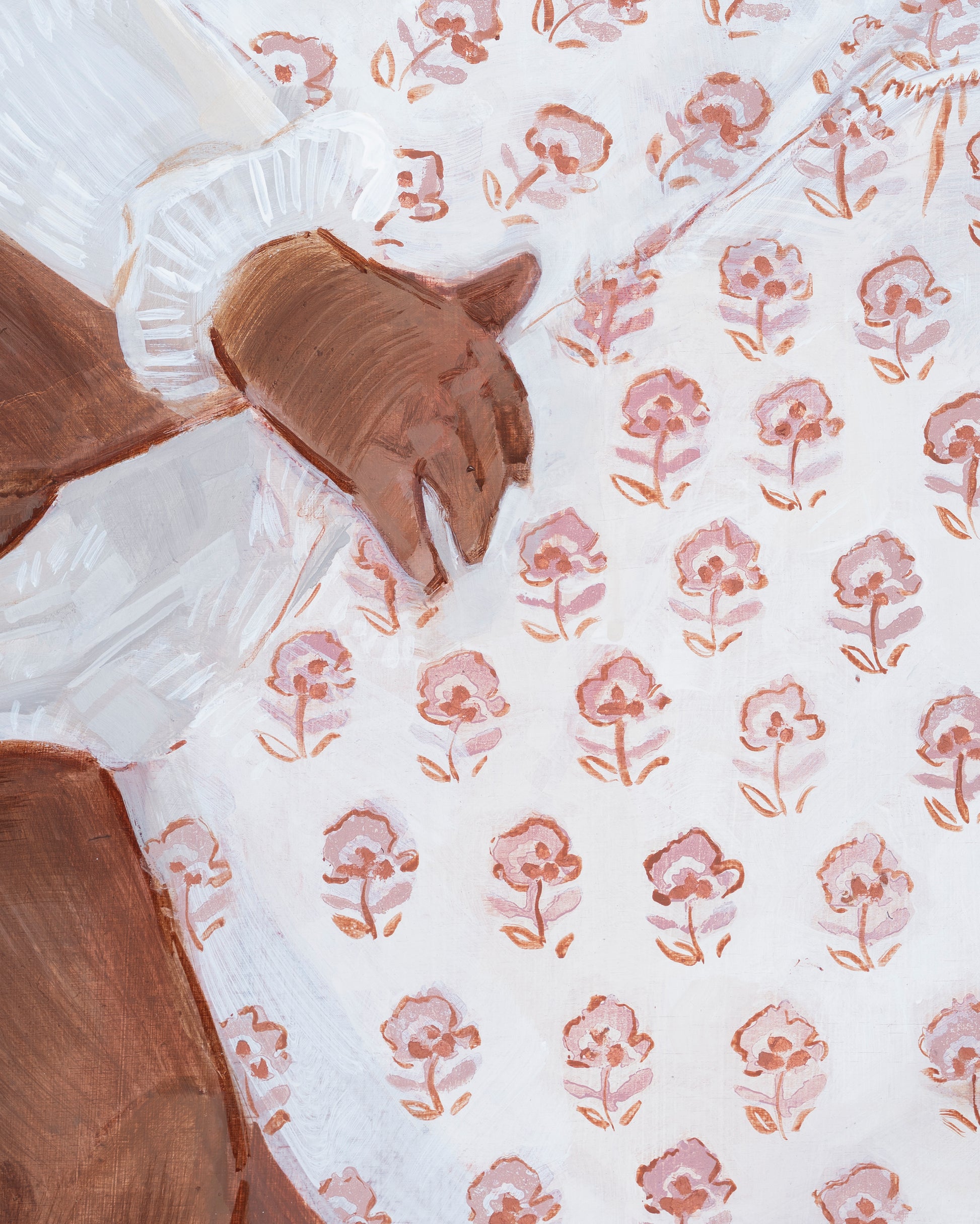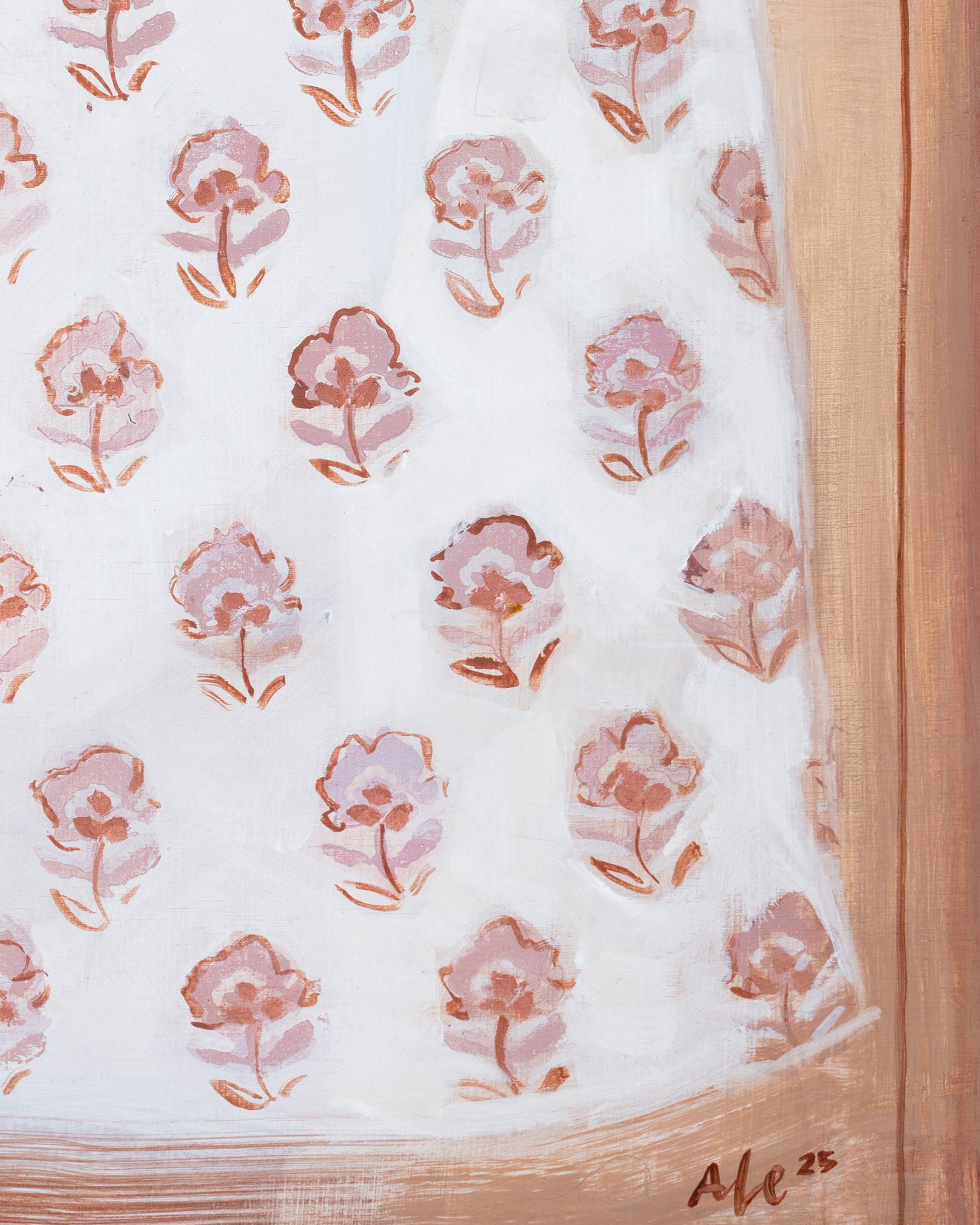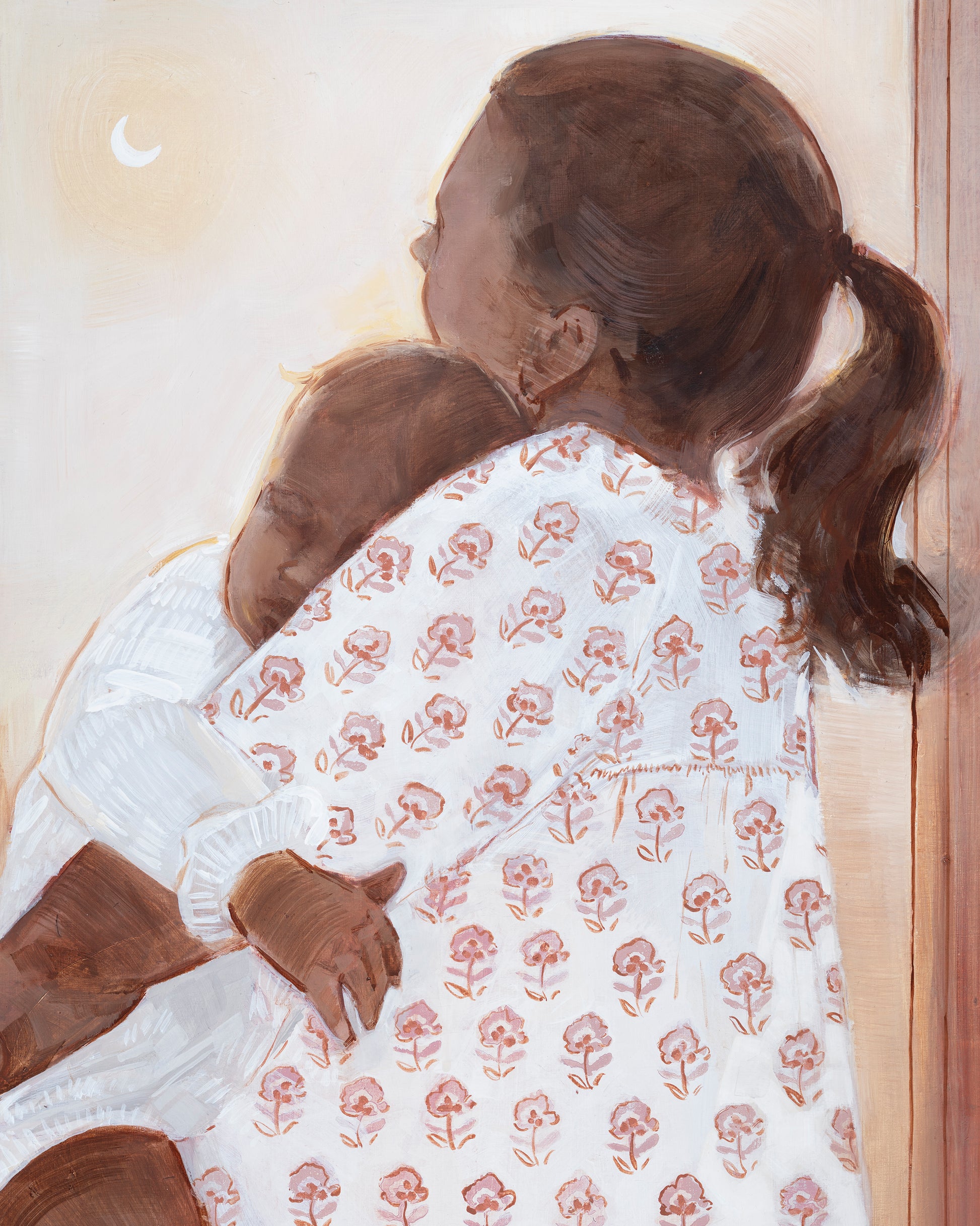 This painting holds a hush of night and the quiet love of a mother. The hand-carved floral stamp was made specifically for this work, adding to the delicate, soft warmth of this painting. The repeating shape, like the repetition of many nights spent holding my little ones.