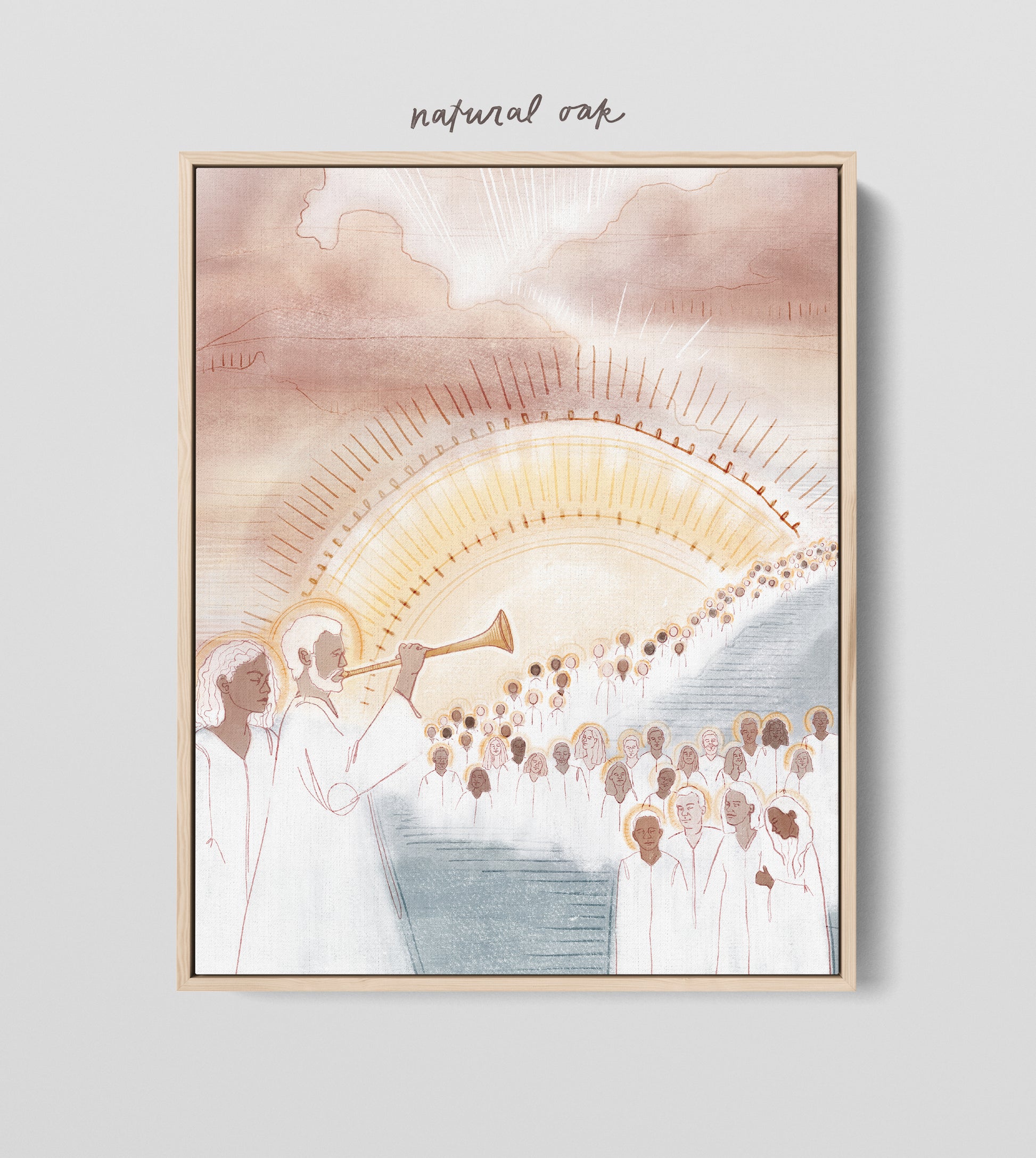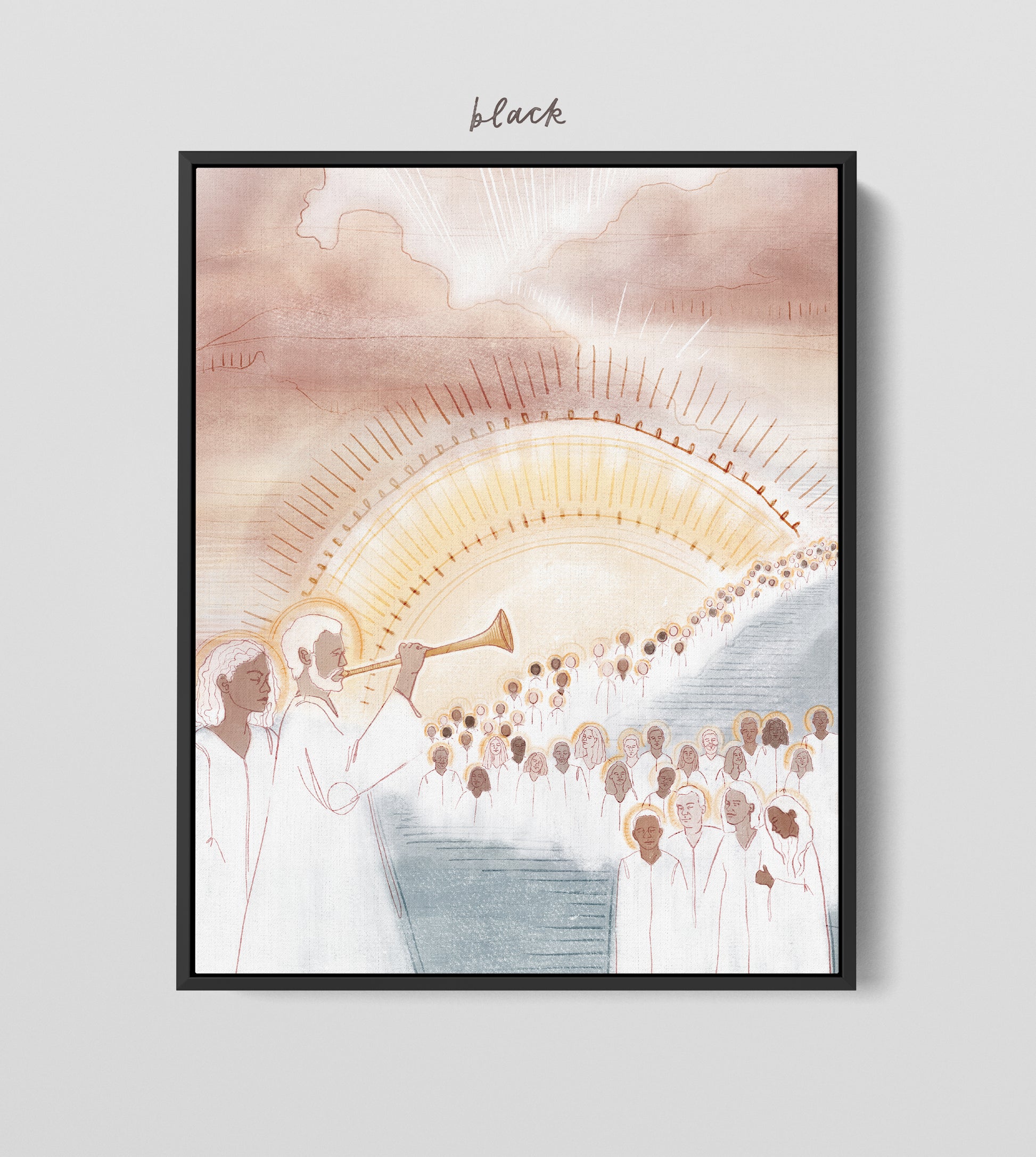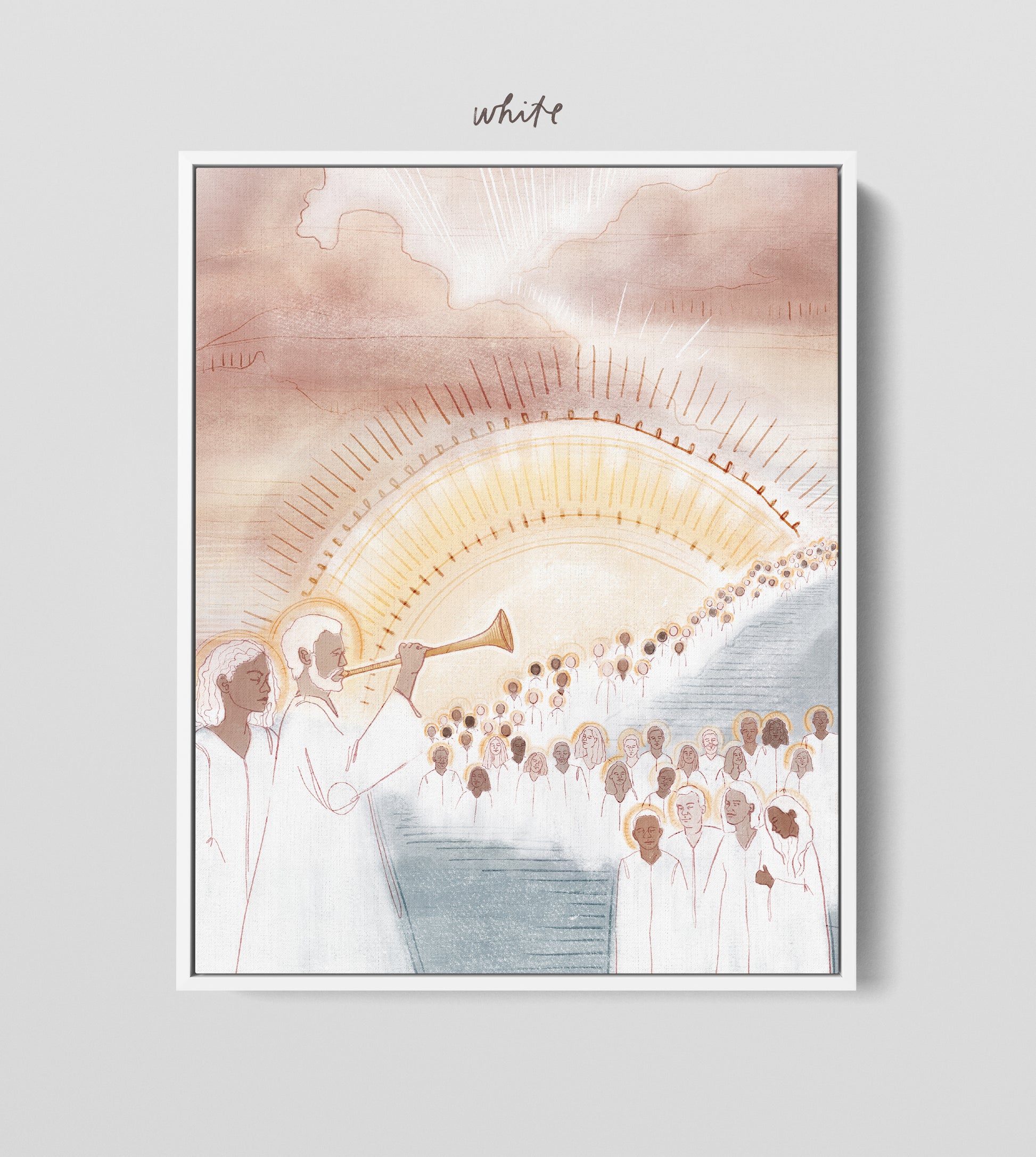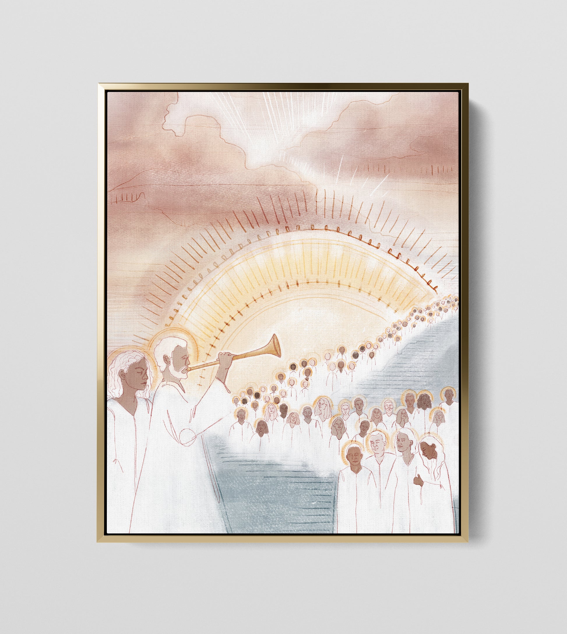 Wrapped in the arms of angels, heavenly and earthly, 'They That Be With Us' Print + Canvas reminds us that we are never alone. Featuring warm shades of pinks and yellows, the crowded sky full of angels is based on 2 Kings 6:16.